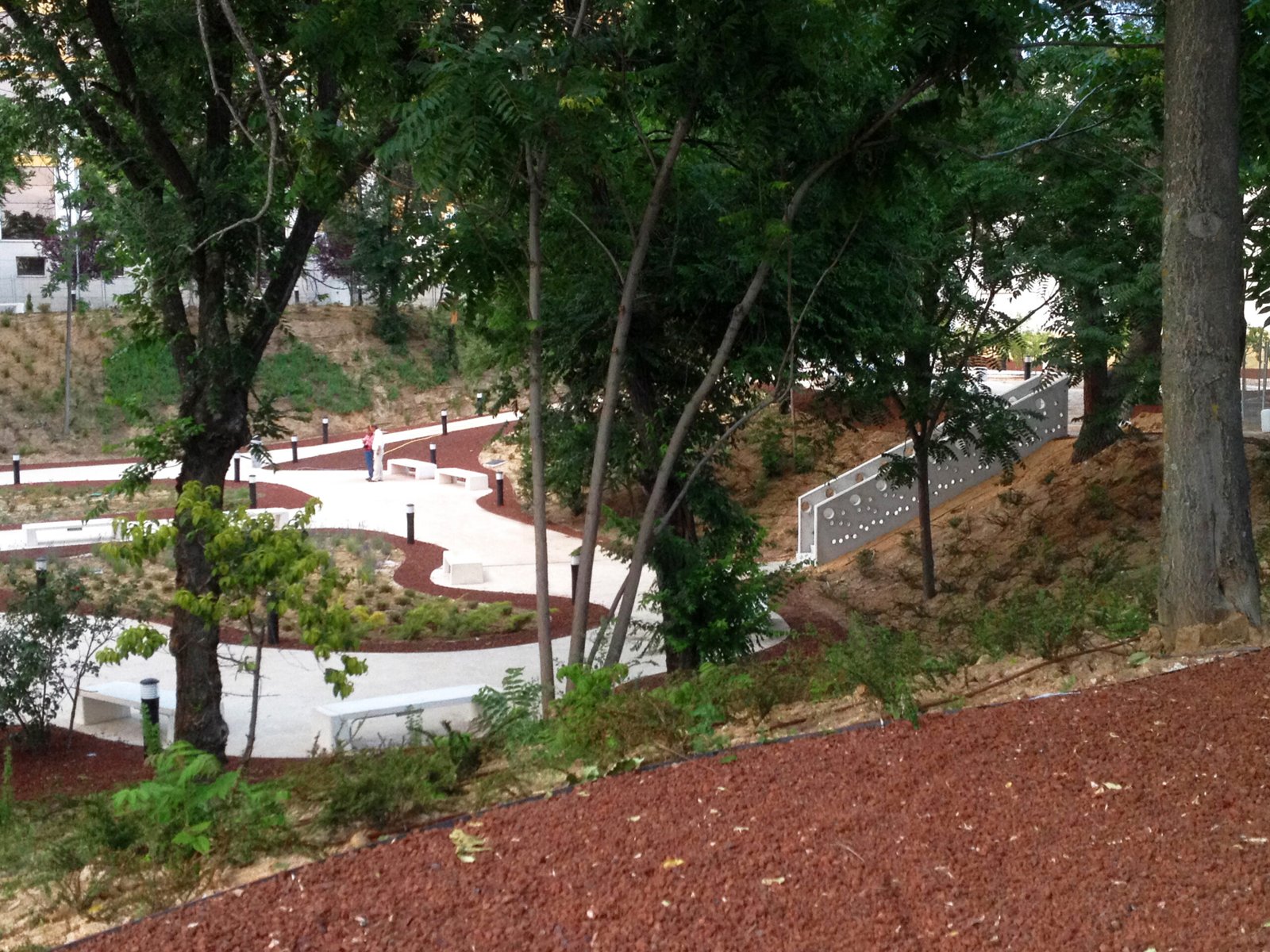 El acabado en hormigón blanco de los caminos proporciona luminosidad a los recorridos, como contrapunto a las sombras de las zonas ajardinadas. El parque es un estímulo para los sentidos. Situado en una hondonada, la topografía permite que los taludes verdes, tapizados de plantas aromáticas y árboles frutales, envuelvan visualmente a lo usuarios, proporcionando una agradable atmósfera natural.