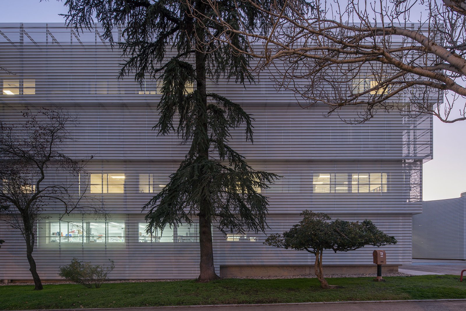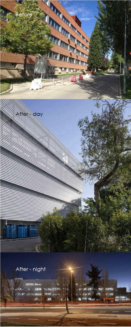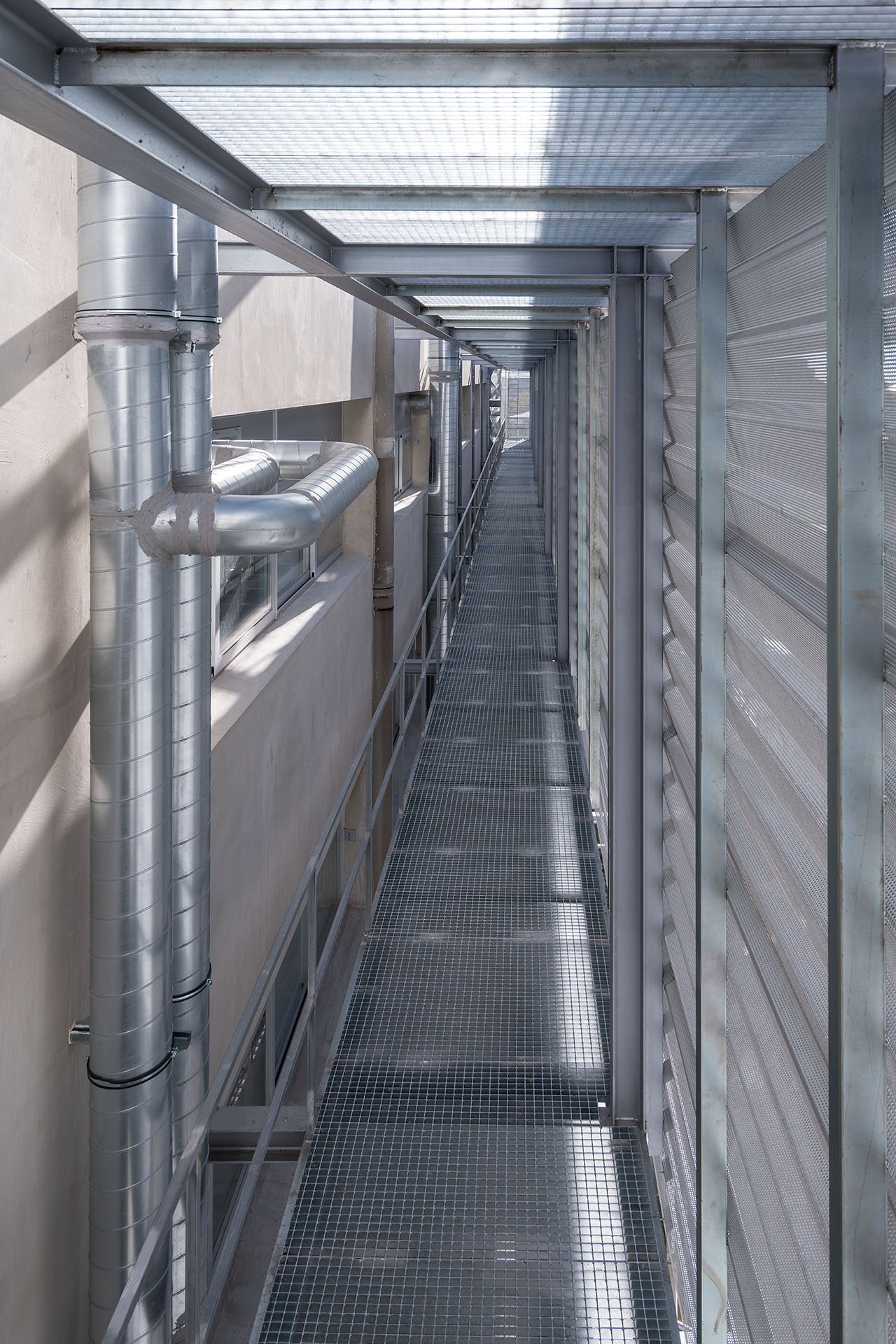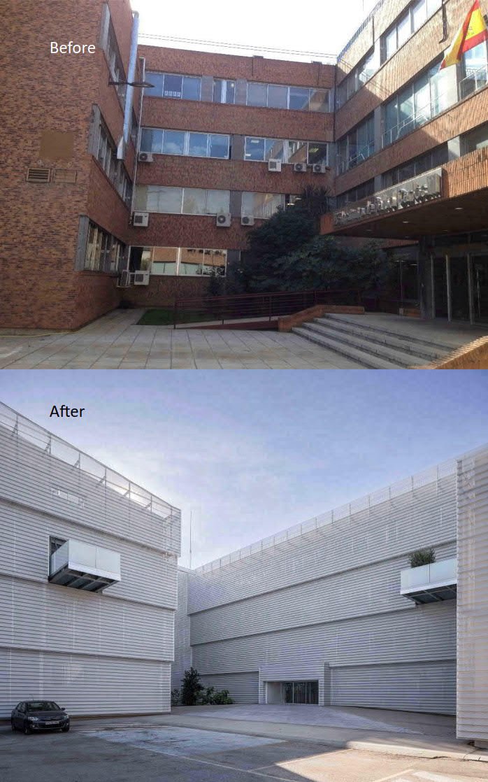 The project involves an insulating exterior cladding on the existing walls, on all the façades, and a new skin of white mesh panels to achieve homogeneous composition and form, which the building previously lacked. This skin allows natural light into the building while mitigating direct sunlight at hotter times of the year and concealing the building’s services. An accessible gallery between this new skin and the building facilitates maintenance and cleaning.