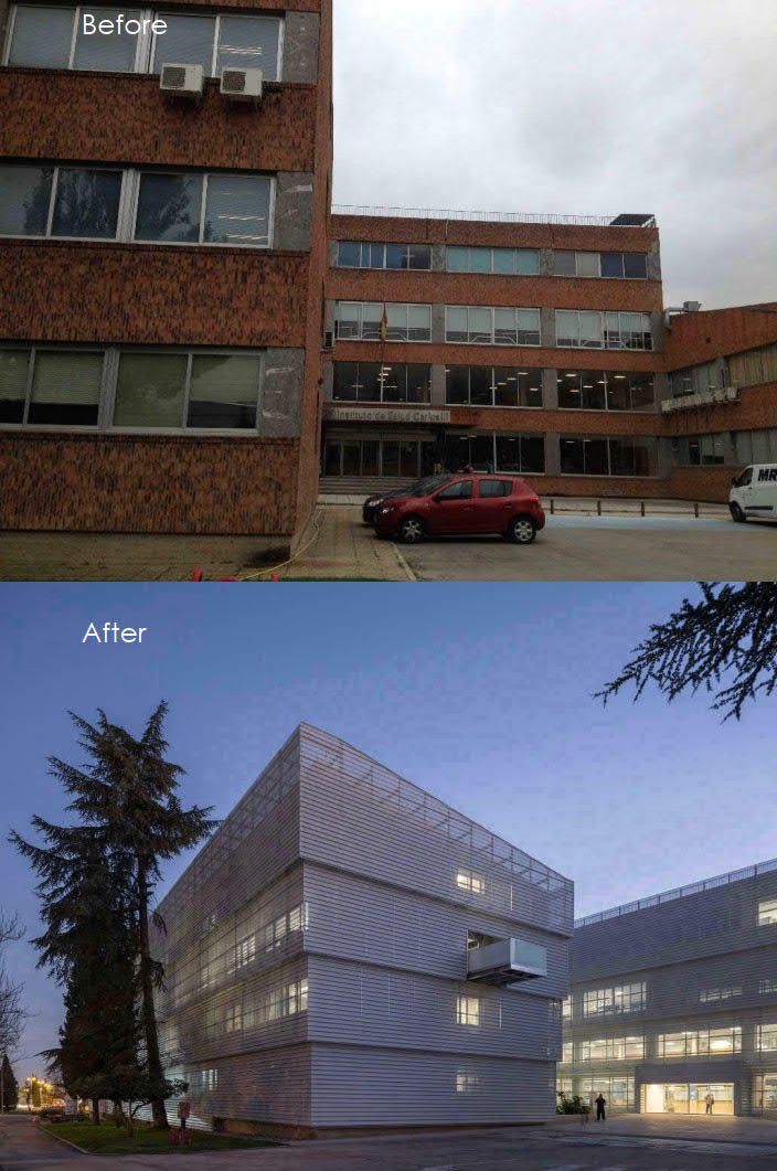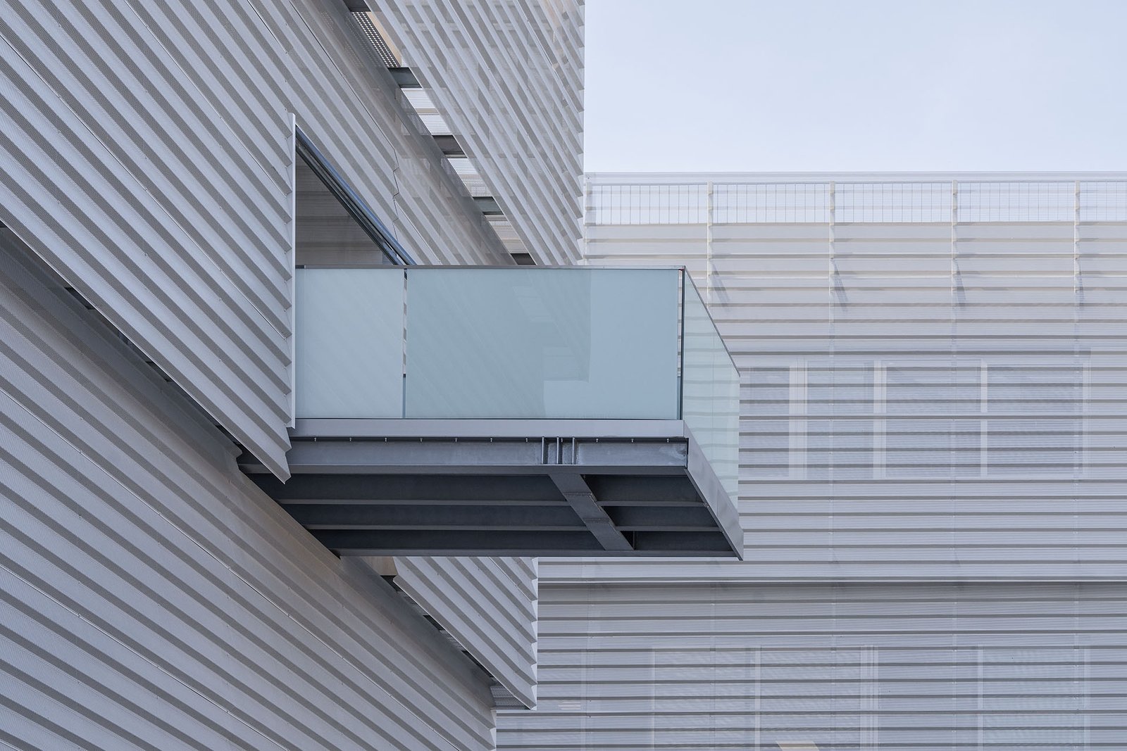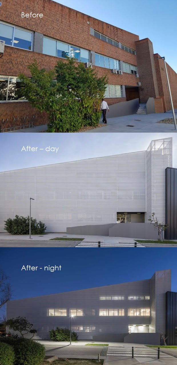The project involves an insulating exterior cladding on the existing walls, on all the façades, and a new skin of white mesh panels to achieve homogeneous composition and form, which the building previously lacked. This skin allows natural light into the building while mitigating direct sunlight at hotter times of the year and concealing the building’s services. An accessible gallery between this new skin and the building facilitates maintenance and cleaning.