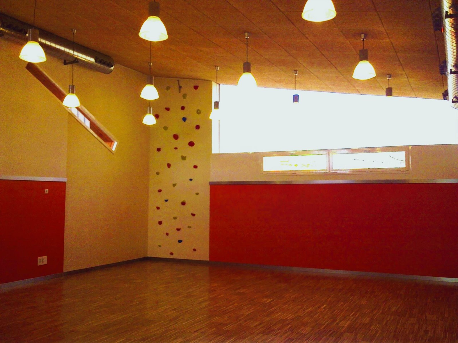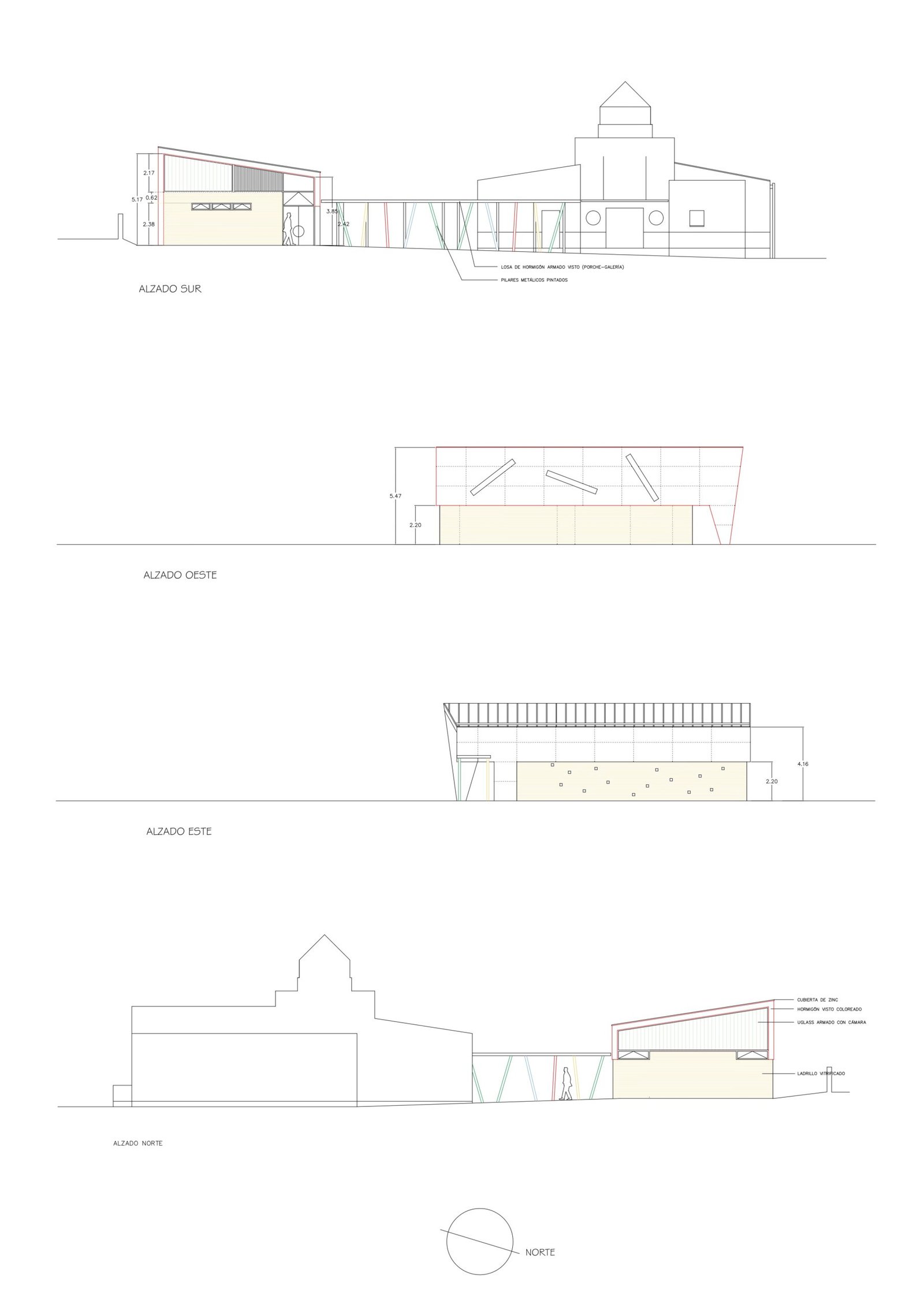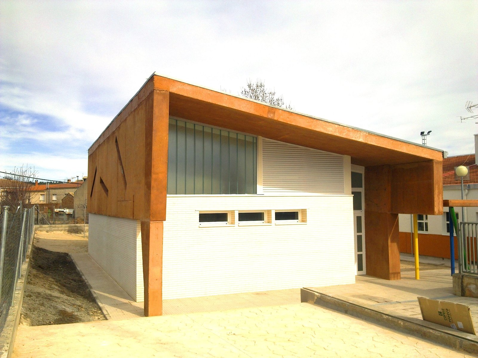 The multi-use centre, located opposite the school entrance, looks like an unopened box made of coloured concrete, resting on white glazed brick walls.