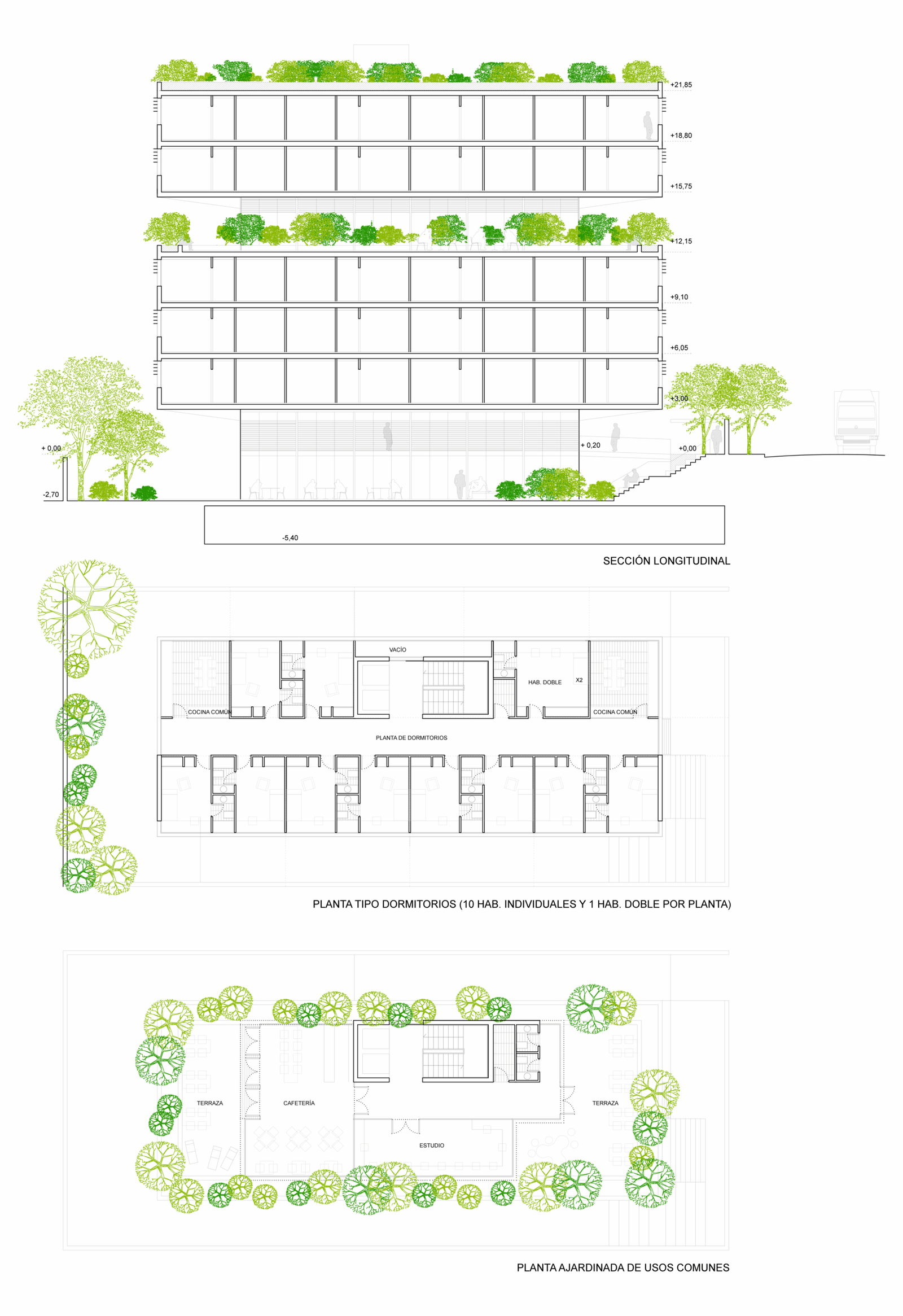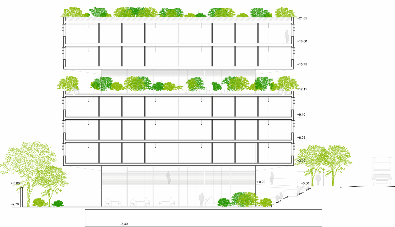 Midway up the building, large planted terraces are combined with a café, study areas, and social spaces.