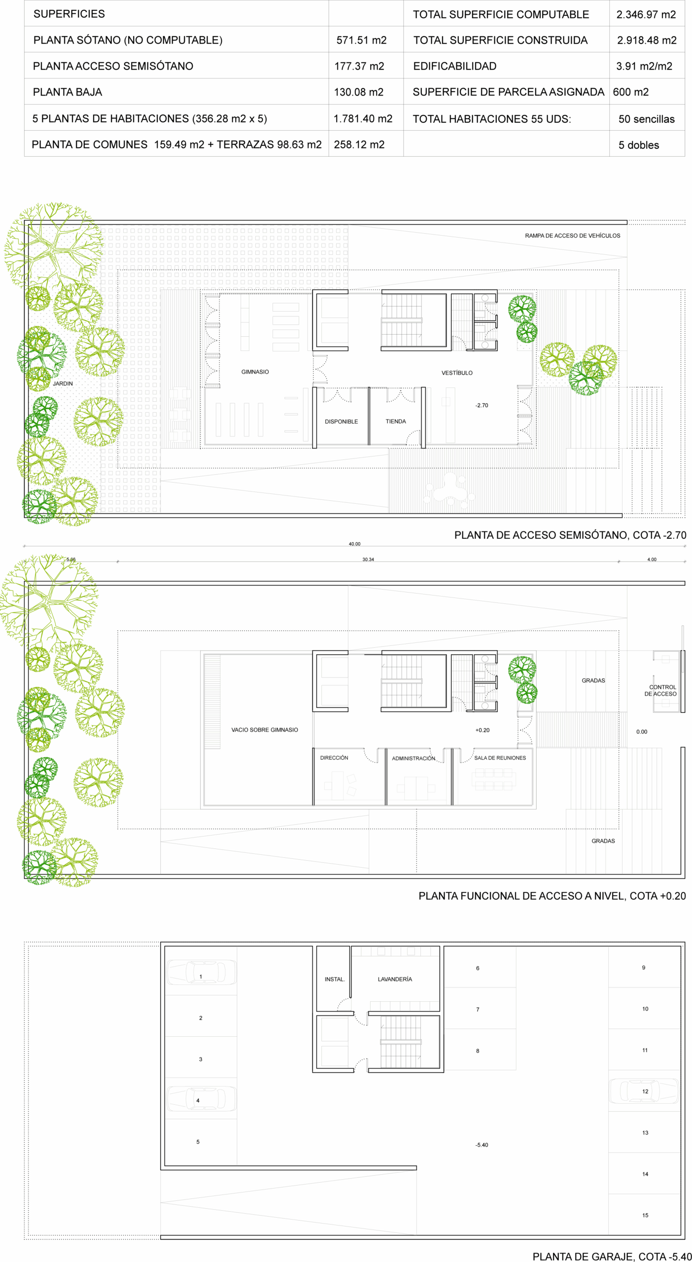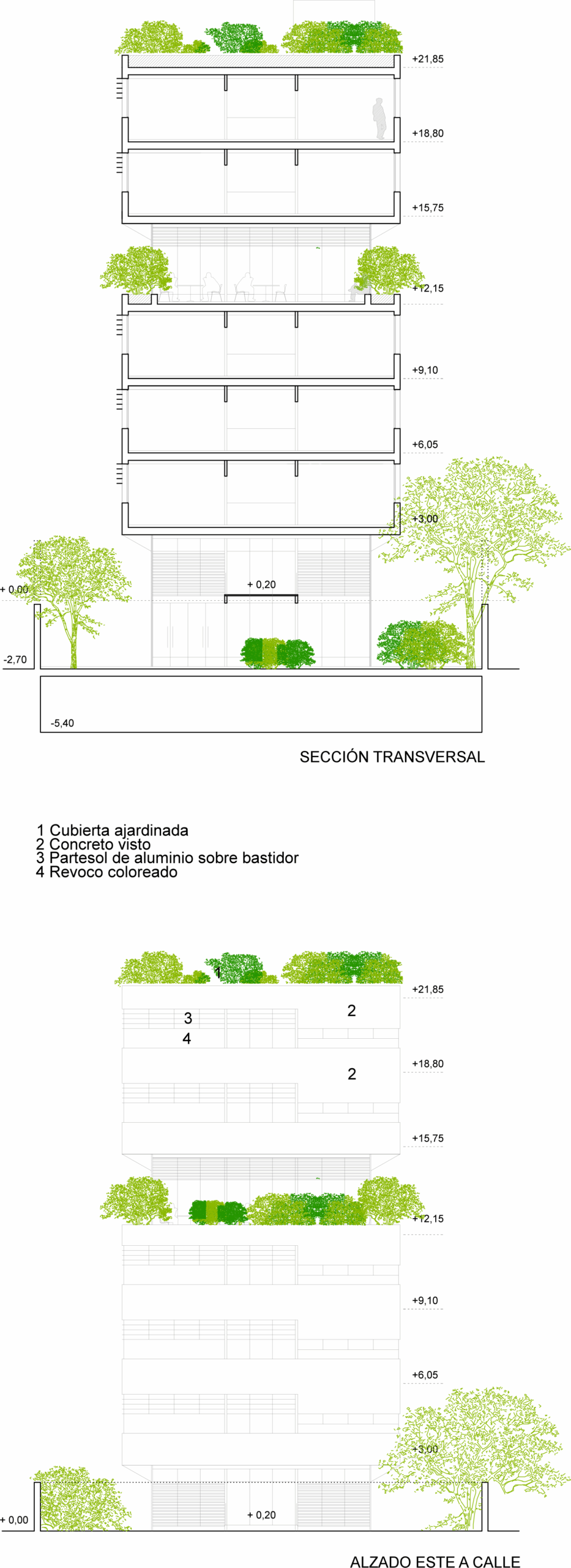 Floors of living space alternate with shared communal floors, while parking space is provided at basement level. The entrance floor is split into two levels—semi-basement and ground floor—taking advantage of the site’s gradient and creating striking double-height interiors.